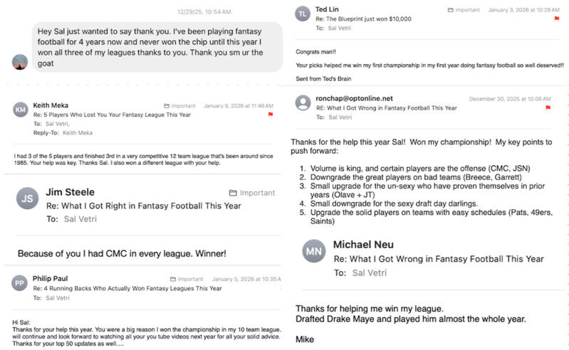 Within the next minute or two, you're going to get an email from me (Sal Vetri)This email contains instructions to get started with The Fantasy Football Playbook, so be sure to check it out!If you don't find the email in your inbox in the next couple of minutes, please check your spam folder :)